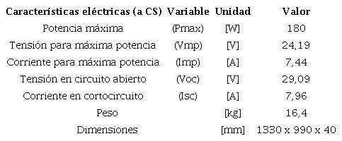El factor global de pérdidas (𝜂p) normalmente se encuentra entre 0,8 y 0,9. En este factor se tienen en cuenta las pérdidas adicionales que pueden ocurrir debido al deterioro y/o a la posible suciedad de los paneles, etc. Se usarán paneles solares policristalinos de 180 W, el número de paneles seleccionado debe ser chequeado dependiendo del tipo de controlador usado. Las especificaciones técnicas del panel fotovoltaico empleado en el diseño del árbol se muestran en la tabla 4.