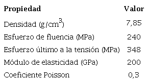 La estructura simplificada del árbol, modelada en el software Cosmo M, se muestra en la figura 9. Las hojas no fueron modeladas en el software de elementos finitos debido a que no son portantes; estas son usadas para dar una mejor apariencia exterior al árbol, sin embargo, su peso si fue considerado para el cálculo de esfuerzo del tronco del árbol y los ramales. En el software, los elementos de la estructura fueron discretizados con elementos tipo Beam 3D. A la mayoría de los elementos se les asignó una sección transversal tubular circular, excepto para la fabricación de la estructura que soporta los paneles, para la cual se usaron perfiles angulares. Las dimensiones de estas secciones variarán dependiendo del comportamiento de la estructura al momento de aplicar las cargas. Se definió la gravedad como 9,81 m/s en la dirección negativa del eje y, para considerar el peso propio de los elementos. Como condición de frontera, se restringieron todos los grados de libertad de la base del árbol. Finalmente, antes de proceder con el análisis de esfuerzo se definieron las propiedades del material de las barras. Las propiedades del material usado para el diseño de la estructura se muestran en la tabla 7.