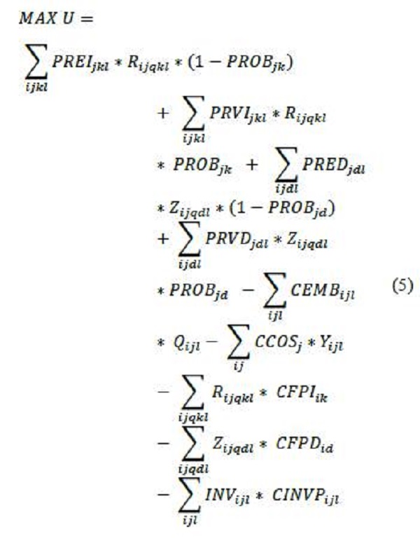 In addition, it exists a deterioration period identified between the time when fruit is harvested and the time when it is delivered to the customer, which affects the product price. In this case the fruit storage time in the producer's facilities is one day, which reduces the deterioration risk. The small producer empirically selects the good quality fruit at the time of harvest. However, the final classification products are not in an optimum harvest point. There is a probability that the product is not accepted as a premium by the customer (intermediary or retailer) according to quality of the product, and based on its appearance which is an empirical practice accepted by producers, intermediaries and retailers. Perishability is included in the model as a deterioration occurrence probability in two instances: the first one in the producer-intermediary flow, and the second one in the intermediary-retail flow. It defined in the model with parameters PROBjk and PROBJd respectively. These parameters are calculated based on the occurrence historical behavior in a defined period of time. They are included in affecting the incomes in the objective function proposed in the mathematical model.