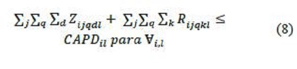 Dispatch capacity constraint: The dispatch capacity CAPDil of plot i on day l, must be greater or equal to the quantity of quality product q dispatched on the day 1, from each plot i to the intermediary k and to the retailer