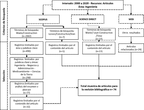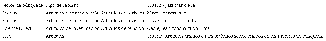 Como protocolo de revisión se establecen los motores de búsqueda: Scopus, ScienceDirect y búsqueda específica de recurso en la web; en cuanto a los criterios de selección se definen: intervalo comprendido entre el año 2000 y el año 2020, área de ingeniería y palabras clave (waste, construction, losses, lean) de acuerdo con lo especificado en la Tabla 2, la cual comprende el motor de búsqueda, el tipo de recurso y el criterio establecido.