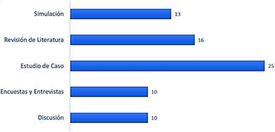 De los 74 artículos analizados, se evidencia que el método de investigación más utilizado es el estudio de caso con 25 artículos (33 %), seguido por la revisión de literatura con 16 artículos (22 %) y los estudios de simulación con 13 artículos (18 %). Las encuestas y entrevistas, así como los artículos de discusión, ocupan los dos últimos lugares con 10 artículos cada uno (13,5 %). En la Figura 2 se observa en forma gráfica el número de artículos por método de investigación.