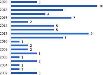 De acuerdo con la Figura 3, los años 2012, 2016, 2018 y 2019 cuentan con el mayor número de publicaciones sobre el total analizado: 9 artículos (14 %) ,7 artículos (10 %), 6 artículos (8 %) y 10 artículos (12 %), respectivamente.