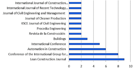 Con 9 publicaciones, Lean Construction Journal es la revista con mayor número de publicaciones, seguida por Conference of the International Group for Lean Construction, Automation in Construction e International Conference, con 8, 6 y 5 artículos, respectivamente. En la Figura 4 se pueden observar las revistas con más de dos publicaciones.