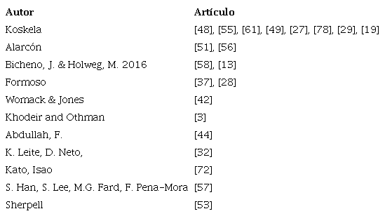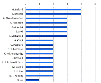 En la Figura 5 se pueden observar los autores que se destacan con 4, 3 y 2 publicaciones en total; esta información, además, permite interpretar que Glenn Ballard y Lauri Koskela, con 4 artículos cada uno, representan los autores con mayor número de publicaciones sobre pérdidas en la construcción. A nivel latinoamericano se destacan Carlos T. Formoso (Brasil) y Luis Fernando Botero (Colombia) con 2 publicaciones cada uno.