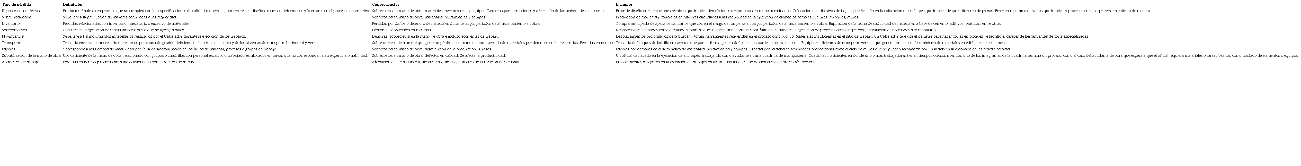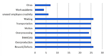 De acuerdo con la revisión de literatura realizada se identificaron 10 tipos de pérdidas: 1) reprocesos/defectos (rework/defects), 2) sobreproducción (overproduction), inventario (inventory), 4) sobreprocesos (overprocessing), 5) movimientos (motion), 6) transporte (transportation), 7) esperas (waiting), 8) subutilización de la mano de obra (unused employee creativity), 9) accidentes de trabajo (work accidents) y 10) otras.