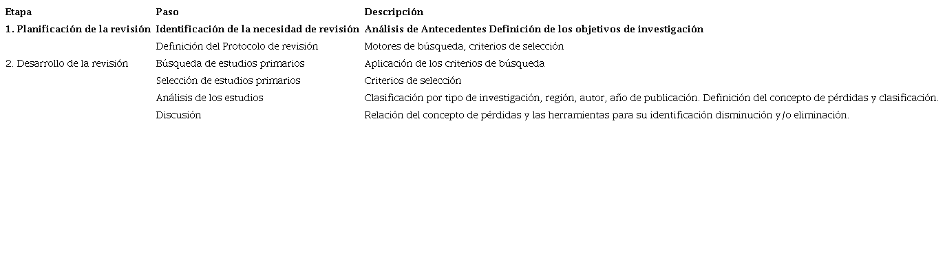 La revisión sistemática de literatura con sus dos fases (planeación y desarrollo de la revisión) permite definir en forma precisa cada uno de los pasos para la búsqueda y selección de artículos, facilitando el proceso de análisis y obtención de resultados, en este caso, sobre el concepto de pérdidas, cuantificación, clasificación y herramientas para su identificación, disminución y/o eliminación.
