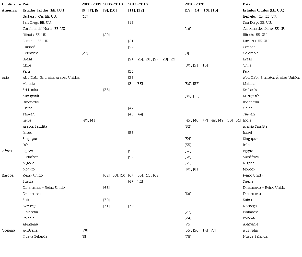 De acuerdo con lo detallado en la Tabla 3, se puede establecer que en el continente americano se ha realizado el mayor número de publicaciones sobre el tema de pérdidas en la construcción (waste) con un total de 29 artículos en los últimos 20 años, 21 de los cuales se realizaron en el período 2011-2020.
