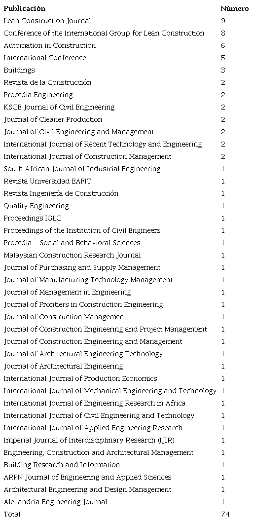 Si bien el Lean Construction Journal es el recurso con mayor número de publicaciones, como lo muestra la Figura 4, es importante mencionar cada uno de los recursos que han considerado la importancia del tema de pérdidas y han realizado mínimo una publicación; esto se muestra detalladamente en la Tabla 4.
