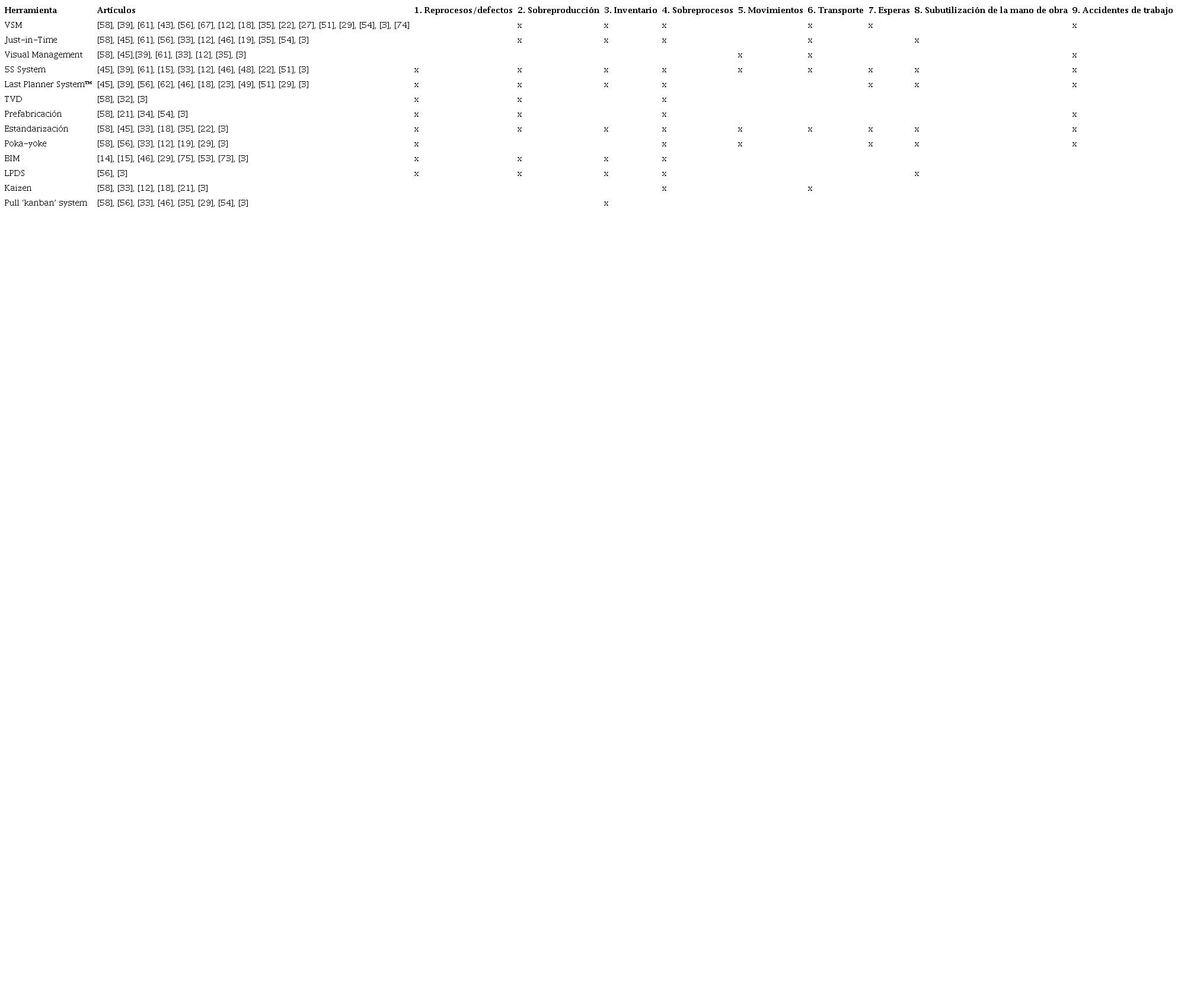 Para la aplicación de estos principios se han desarrollado herramientas que buscan, entre otros, la eliminación de las pérdidas, razón por la cual resulta de gran importancia revisar la literatura alrededor de este tema, que es clave para el desarrollo, la productividad y la eficiencia del sector de la construcción.
