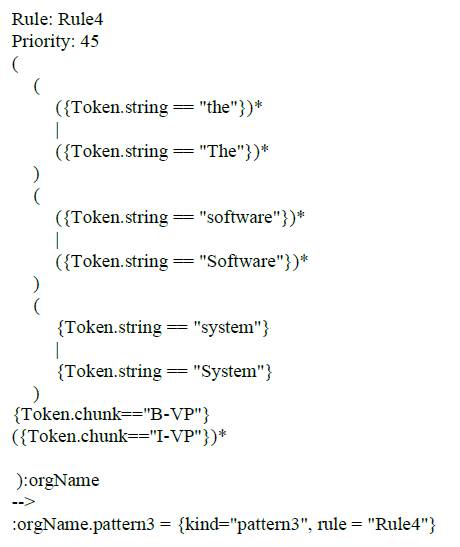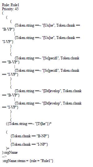 Such structures must be programmed in JAPE (Java Annotation Patterns Engine), a GATE component for creating patterns to be matched by the corpus when processing the structures [13]. For example, we create the following rule: