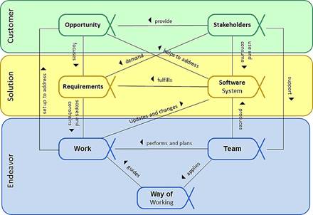 Essence kernel is categorized in the following areas of concern: client, solution, and endeavor. Some universal dimensions-they are called alphas in Essence-are present in any software engineering project and they are specialized in such areas of concern. Alphas represent “the things we always work with,” and they allow for tracking the health and progress of software engineering projects via alpha states. Also, Essence comprises activity spaces and competencies. Activity spaces represent “the things to do” in a software engineering project. “They provide descriptions of the challenges a team faces when developing, maintaining, and supporting software systems;” and competencies represent the abilities, capabilities, and skills required for performing the work in a software engineering project [2]. Essence kernel alphas and their relationships are presented in Figure 2. Be advised that Essence kernel alphas can be seen as the counterpart of PMBOK knowledge areas. Also, Essence kernel activity spaces can be seen as the counterpart of PMBOK process groups.