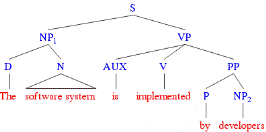 We present the syntactic structure of the sentence “The software system is implemented by developers” in Figure 5.