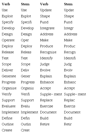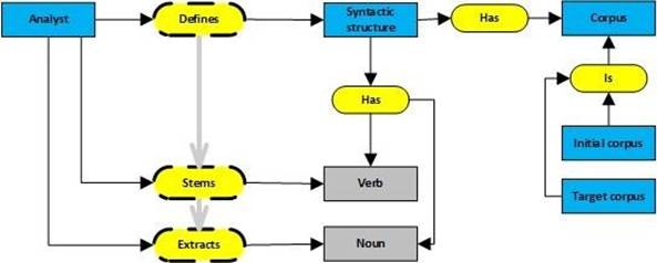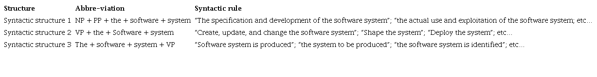 After we gather the information from the initial corpus, we need to define syntactic structures where verbs related to the software system dimension appear in such a corpus. Some of the syntactic structures defined are presented in Table 3.