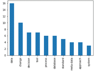In this step, we execute in GATE all of the syntactic structures defined in the previous step and extract candidate nouns (154) to be considered knowledge areas. Next, we lemmatize such nouns, and we perform frequency analysis. So, we can choose a candidate to be the counterpart knowledge area of the software system dimension from the initial corpus into the target corpus. In Figure 7 we present the ten most common nouns extracted from the target corpus.