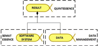 If we consider a software system as a sub-alpha of result, we can also say as a conclusion that data is also a sub- alpha of result in the domain of data management (see Figure 8]. Several disciplines keep the same names for some dimensions, e.g., requirements alpha of the Essence kernel and managing requirements knowledge area of PMBOK.