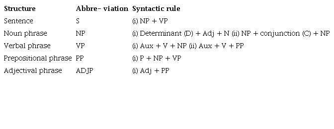 Chomsky [14] defines syntactic structures as trees for generalizing language sentences. Some rules are used for syntactically structuring natural language and they are based on grammatical categories. Some of the grammatical categories are nouns (N), verbs (V), prepositions (P), adjectives (Adj), and adverbs (Adv).