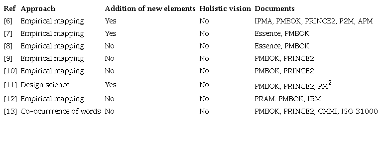 The aforementioned proposals are empirical and dependent on the author’s judgment since they use informal methods for performing such comparisons. Such proposals can be improved by using a formalized adoption of new elements when comparing project management standards.
