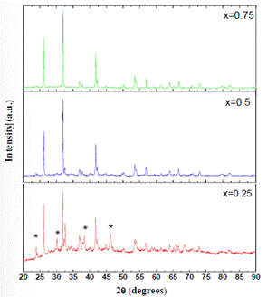 Figure 1 shows the XRD collected patterns of the Ba1- xNaxCoO3 (x = 0.25, 0.5, 0.75) system. The samples showed similar diffraction patterns. However, the sample with the lowest sodium concentration (x = 0.25) showed additional diffraction peaks (*), which are associated with a second phase of Co3O4 (9 %). This behavior has been observed in systems with La1-xBaxCoO3 stoichiometry, where structural transitions have been reported [12].