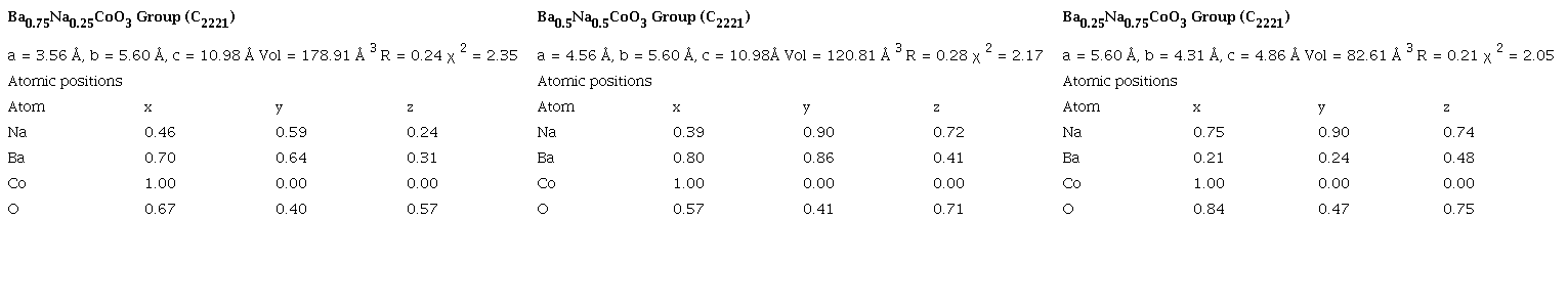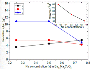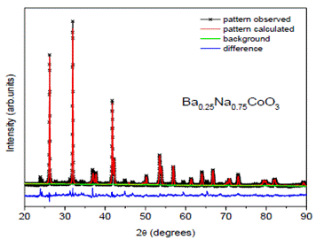Rietveld refinement of the XRD pattern for the sample Ba0.25Na0.75CoO3 (x = 0.75) is shown in Figure 2. Here, the red line is the theoretical pattern. The crosses represent the experimental diffractogram, the green line represents the background, and the blue line is the difference between the experimental and the theoretical patterns. The lattice parameters, obtained via Rietveld refinement, are listed in Table 1. The Rietveld refinement analysis made it possible to identify an orthorhombic- type polycrystalline system with a majority phase of space group C2221 (N° 20). Figure 3 shows lattice parameters a, b and c as a function of sodium concentration. The lattice parameter a seems to be proportional to the sodium concentration increase.