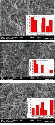 Finally, the average crystallite size of the samples was estimated using the Scherrer formula. In all the samples, the average crystallite size was around 76 µm. Figure 4 shows the SEM images of sodium-doped samples at 2.5 kx magnification. The SEM images revealed the formation of porous particles with randomly oriented grains of different shapes and sizes. In particular, the microstructure for x = 0.25 [Figure 4a) is more homogeneous than for x = 0.5 and x = 0.75 [Figures 4b and 4c, respectively). However, a fluctuation in the size and distance between the grains as the sodium concentration changes is observable (see insert figure). The foregoing shows that the sodium concentration affects the particle size of the system under study.