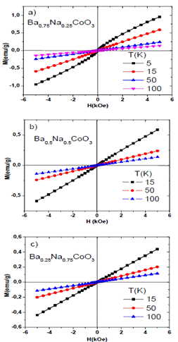 The molar magnetic susceptibility measured in zero- field-cooled (ZFC) mode for Ba1-xNaxCoO3, within the temperature range of 5-300 K, is presented in Figure 5. The samples with x = 0.5 and x = 0.75 exhibited a paramagnetic behaviour. In contrast, for x = 0.25, the sample showed a broad maximum around 33 K, suggesting an antiferromagnetic ordering with transition temperature Néel TN ≈ 33 K.