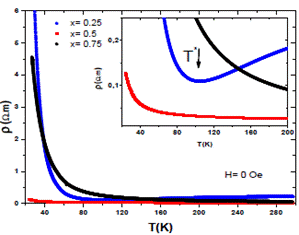 Thus, it is reasonable to assume that the difference in the magnitude of the electrical resistivity is mainly attributed to the difference in the charge carrier density. This means that the sodium content can control the charge carrier density. In the sample with x = 0.25, we have observed a metal-insulator transition (inset in Figure 8]. The electrical resistivity first decreases with an increase of temperature up to a typical temperature T* ~ 105 K, indicating an insulator behaviour (dρ / dT < 0). At T > T* where the resistivity increases with temperature showing a metallic behaviour (dρ / dT > 0).