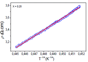 Figure 9 shows a 1/T-1/4 dependence on the resistivity for x = 0.25. The slope depends on the temperature. This suggests that ρ does not follow a simple activation likely due to the spin state [14], [15], [16], [17], [18]. Local activation energy Eloc was found to be around 3.96 meV which is quite reasonable for this system. This value has the same order of magnitude seen in the electronic transition of LaCoO3 [17]. Finally, a Ca-doped system (x = 0.2) study reported a metal-insulator transition at high temperatures in the paramagnetic state [19].