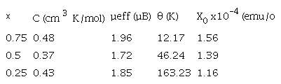 (2)The obtained magnetic parameters are presented in Table 2. The decrease in θ with changes in the sodium content suggests that the antiferromagnetic interactions increase. Likewise, the positive theta value (θ > 0) indicates spin ferromagnetic interactions. On the other hand, theoretically, the values of effective magnetic moment (µeff ) are determined by equation 3.