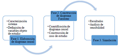 Para la aplicación de la dinámica de sistemas se sigue la metodología presentada en la Figura 1, donde inicialmente se construyó el diagrama causal, el cual evidencia la relación de todas las variables que intervienen en el sistema y ayuda a tener una visión más amplia y clara de la realidad. Luego, se elaboró un diagrama de Forrester, donde se pretende cuantificar las relaciones expresadas previamente en el diagrama causal. En esta fase se ingresaron datos e información referente a la implementación del proyecto en la compañía. Por último, se realizó la simulación, analizando los principales resultados encontrados.