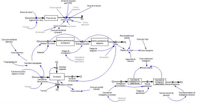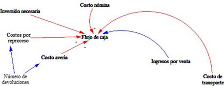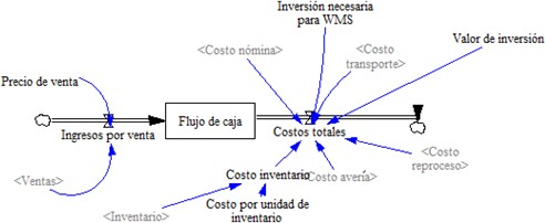 La Figura 10 muestra el esquema del flujo de caja, el cual tiene como entrada los ingresos por venta; la salida son los costos totales: costo de avería, costo de reprocesos, costo de transporte, costo de nómina, costo de inventario y el valor de la inversión. En la Figura 11 se presenta el diagrama Forrester general.