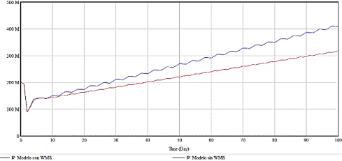 Tal como se puede ver en la Figura 12, el flujo de caja obtenido a largo plazo es mayor cuando la empresa ha implementado el WMS en comparación con el escenario de funcionamiento tradicional (sin WMS). El incremento aproximado gracias a la implementación de la herramienta se estima en 80 millones de utilidad adicionales, lo que refleja un aumento del 25 % comparado con un escenario donde no se implementa el sistema de gestión de almacenes.