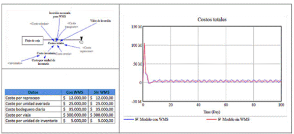 En la Figura 4 se muestra cómo el flujo de caja se puede ver afectado directamente por variables como costo de reprocesos, costo por averías, inversiones necesarias, costo de nómina y costo de transporte; esto se debe a la poca organización logística de una empresa en el tema de inventarios, por esta razón existen herramientas como el WMS que entra a solucionar y corregir este tipo de variables. La variable que tiene un efecto positivo en el flujo de caja son los ingresos por venta.