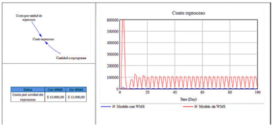 Uno de los costos que influye en el flujo de caja es el costo por reproceso, que se obtiene de la multiplicación del costo por unidad de reproceso y la cantidad de devoluciones a reprogramar. Tal como se puede observar en la Figura 14, con la implementación del WMS este costo promedio es mínimo, entre los 3 mil y 12 mil pesos, mientras que sin el WMS este costo es mayor y varía entre los 80 mil y los 120 mil pesos. Este es uno de los datos con un cambio significativo que muestra la simulación.