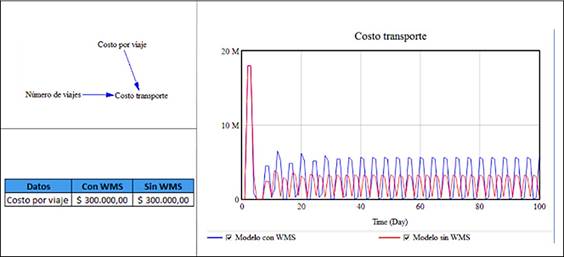 Otro de los factores a analizar es el costo de transporte, este es igual a la multiplicación entre el número de viajes y el costo por viajes. Como se puede ver en la Figura 16, este costo aumenta con la implementación del WMS, lo cual en este caso no es un resultado negativo, ya que con la implementación de la herramienta lo que se busca es ser más eficientes en los alistamientos de pedidos, de esta forma los procesos de alistamiento serán mucho más rápidos, habrá mayor número de viajes y se podrán sacar muchas más unidades en el día. Así, al aumentar el costo de transporte, aumentan también los ingresos (véase la Figura 17].
