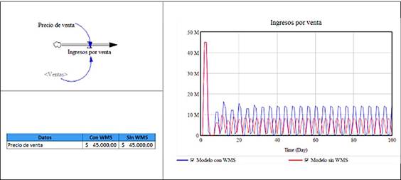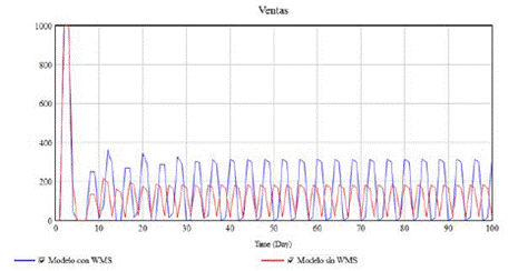 Los ingresos por ventas se calculan con el precio de venta por la cantidad vendida. En la Figura 18 se puede analizar cómo los ingresos por ventas aumentan con la implementación del WMS y se mantienen en el tiempo, en comparación con el modelo sin esta herramienta.