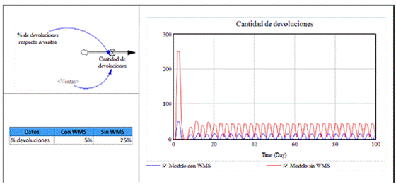 Uno de los factores por los cuales la empresa se ha visto afectada directamente han sido las devoluciones; en la Figura 19 se demuestra cómo el WMS afecta directamente este factor, arrojando un resultado positivo. La cantidad de devoluciones se obtiene con la multiplicación del porcentaje de devoluciones respecto a ventas, el cual en este caso es 0,05 %, por el número de ventas.