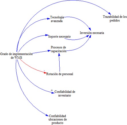 En la Figura 2 se muestra una parte del diagrama donde el grado de implementación del sistema WMS tiene una influencia positiva en sus variables consecuentes.