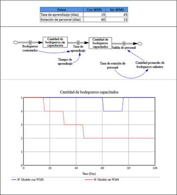 En la Figura 20 se puede analizar cómo con un modelo sin WMS la tasa de capacitación es tan baja que no se alcanza a recuperar en un lapso de 100 días para tener más de dos personas capacitadas, mientras que con el modelo con WMS los tiempos de capacitación son más cortos, y se logra mantener un margen de cinco bodegueros capacitados por un mayor lapso, lo que ayuda a que los tiempos de alistamiento sean menores y se cumpla con la promesa de entrega al cliente final.