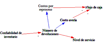 En la Figura 3 se puede observar que cuanto mayor es la confiabilidad del inventario, hay menos devoluciones. Asimismo, cuanto mayor es el número de devoluciones, el nivel de servicio tiende a disminuir. Adicionalmente, existen dos costos que intervienen también en el número de devoluciones, donde a mayor número de productos devueltos por el cliente por errores logísticos, mayores serán los costos por reproceso y los costos por avería, trayendo consigo una disminución en el flujo de caja.