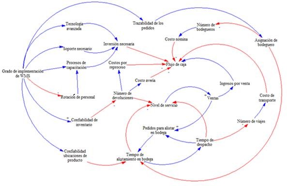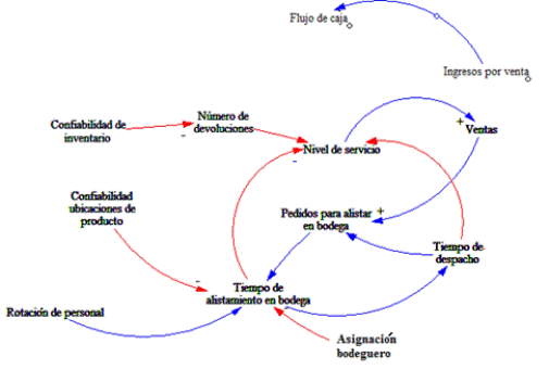 En la Figura 5 se muestra el efecto de los tiempos de alistamiento en los ingresos por venta y, a su vez, en el flujo de caja. Cuanto mayor sea el tiempo de alistamiento en la bodega, mayor será el tiempo de despacho, provocando así un efecto negativo en el nivel de servicio. Cuando el nivel de servicio mejora, las ventas también lo hacen, trayendo así mayores ingresos por venta y mayor número de pedidos para alistar en bodega. Cuando el tiempo de despacho es menor, los pedidos para alistar también serán menores y el nivel de servicio será mayor. Es necesario tener en cuenta que a medida que la rotación de personal sea menor, el tiempo de alistamiento se reduce. Asimismo, a medida que la confiabilidad de las ubicaciones del producto sea mayor, más fácil será para el bodeguero encontrar el producto, y, por ende, el tiempo de alistamiento disminuirá. El diagrama causal completo se presenta en la Figura 6.