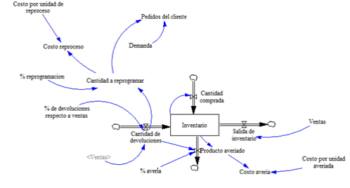 En la Figura 7 se puede observar que el inventario tiene una tasa fija de entrada (la cantidad comprada), siempre y cuando el inventario esté agotado o por debajo de cierta cantidad. Este inventario también se alimenta de la cantidad de devoluciones que realicen los clientes, la cual depende de un porcentaje tanto de devoluciones como de las ventas. Algún porcentaje de las devoluciones se reprograma, generando así costo de reprocesos. También hay una salida de inventario que tiene que ver con las ventas y con los productos averiados; todo producto averiado depende de la cantidad de devoluciones y del porcentaje de averías. Este producto averiado genera un costo que junto con el costo de reproceso afectan directamente al flujo de caja.