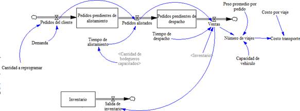 Los pedidos de los clientes provienen de una demanda y de la cantidad a reprogramar de las devoluciones, como se puede observar en la Figura 8. Estos pedidos se convierten en ventas, dependiendo del tiempo de alistamiento y el tiempo de despacho, y generan un nuevo costo: el transporte, el cual a su vez depende del número de viajes por el costo de flete de cada viaje. A partir del volumen de ventas y de la capacidad de vehículo, se puede calcular el número de viajes.