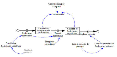 La cantidad de los bodegueros se ve afectada por la contratación y el despido. Hay una variable que se tiene en cuenta que es el tiempo de aprendizaje de los bodegueros nuevos; el WMS aumenta la tasa de aprendizaje del personal, por lo que una mayor cantidad de bodegueros se encontrarán capacitados y ayudarán a que el tiempo de alistamiento promedio de los pedidos disminuya. El costo de nómina depende tanto del personal capacitado como del personal sin capacitar por el costo por bodeguero (véase Figura 9].