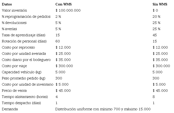 Para la simulación del modelo se utilizan los datos que se muestran en la Tabla 1. Se debe tener en cuenta que estos datos son tomados de la información adquirida antes y después de la implementación de la herramienta WMS en la empresa, con el fin de obtener una comparación entre los dos modelos.