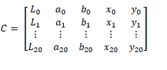 La imagen se divide en superpíxeles mediante el algoritmo SLIC [22]. Una imagen de 𝑁 píxeles se divide en 𝑘 regiones rectangulares o superpíxeles de dimensión 𝑆 × 𝑆, donde 𝑆 = √𝑁/𝑘. Cada superpíxel 𝑖 es representado en la matriz 𝐶 por un centroide definido como un vector de cinco dimensiones 𝑖 = [ 𝐿𝑖 𝑎𝑖 𝑏𝑖 𝑥𝑖 𝑦𝑖 ]. Para el caso de 20 superpíxeles (figura 3a), véase ecuación 1.