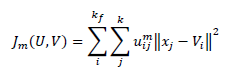 (3)Se define el vector 𝑉 = {𝑣1, 𝑣2, ⋯ , ??𝑘𝑓}, los elementos de 𝑉 serán los centroides o patrones de cada grupo; estos centroides se escogen de manera aleatoria, por lo que en primera instancia son llamados prototipos. Los agrupamientos prototipos y la matriz de partición difusa se obtienen minimizando la siguiente función objetivo: