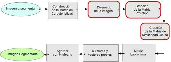 Este trabajo tiene como objetivo reducir los datos por procesar y proporcionar un criterio más óptimo para la construcción de la matriz de similaridad, por lo que se propone un algoritmo híbrido que combine las bondades que ofrecen las técnicas de agrupamiento espectral, superpíxeles y agrupamiento difuso. El trabajo se organiza de la siguiente manera: en la sección 2 se abordan las etapas del algoritmo propuesto -Superpixel Fuzzy Spectral Clustering (SFSC)-; en la sección 3 se evalúa el algoritmo propuesto; y finalmente, en la sección 4 se presentan las conclusiones y trabajos futuros.