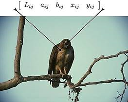 Para la construcción de la matriz de características se tienen en cuenta los componentes (𝐿, 𝑎, 𝑏) del modelo de color CIElab, al igual que la ubicación espacial (𝑥, 𝑦) del píxel, donde la luminosidad (L) varía entre 0-100, a representa las coordenada rojo/verde y b representa las coordenadas amarillo/azul; se organizan en un vector de cinco posiciones [27]. En la figura 2 se ilustra la posible representación del vector característico de un píxel ubicado en la posición (𝑖, 𝑗).
