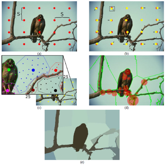 (1)Los 𝑘 centroides son trasladados a una nueva posición, la que presente el menor valor de gradiente (figura 3b); el valor de gradiente se calcula en un vecindario de 3 × 3 alrededor del centroide inicialmente definido. Esto se hace para evitar centrar un superpíxel en un borde, y reducir la posibilidad de sembrar un centroide en un píxel